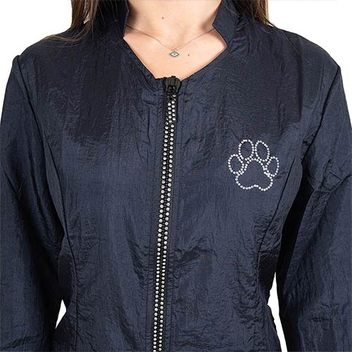 Bluza groomerska o bardzo eleganckim fasonie, taliowana, z błyszczącymi ornamentami na zamku błyskawicznym, krawędziach kieszeni i ozdobnym wzorze na klatce piersiowej.