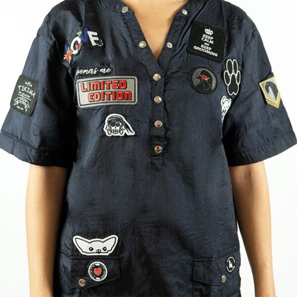 Bluza ma szeroki i prosty krój. Jest ozdobiony oryginalnymi psimi naszywkami. Dekolt w kształcie litery V można nosić mniej lub bardziej otwarty dzięki długiemu rzędowi zatrzasków. Posiada dwie praktyczne kieszenie z przodu z klapką do zamykania.