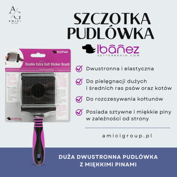 Dwustronna, elastyczna szczotka typu pudlówka od Ibanez to niezastąpione narzędzie do pielęgnacji dużych i średnich ras psów oraz kotów.