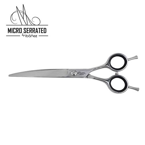 Profesjonalne nożyczki groomerskie gięte Ibanez Moon z ostrzem z mikroszlifem, które zapewnia lepszą kontrolę nad włosem podczas cięcia.